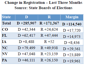 OFA has also been highly effective at registering Latinos in the swing states, a demographic that leans heavily Democratic. They’ve been especially effective registering young Latinos. In fact, in Colorado, Florida, Iowa, North Carolina, Nevada, Ohio, Pennsylvania, Virginia and Wisconsin, 79% or more of the new registrations since August 1st have been under age 30, women, African American or Latino.