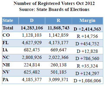 The campaign held a call for media to discuss the numbers. On the call were Jim Messina, Campaign Manager, Jeremy Bird, National Field, and Ben LaBolt, National Press Secretary. Messina is a data-driven guy. Every morning, the first thing he does is look at numbers. “Not poll numbers but voter registration numbers and early voting numbers,” he said.” Those are the numbers that matter to me.”