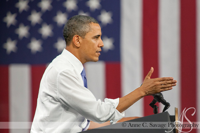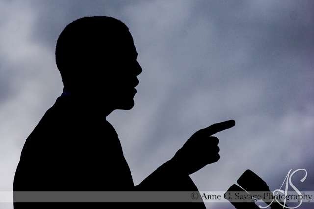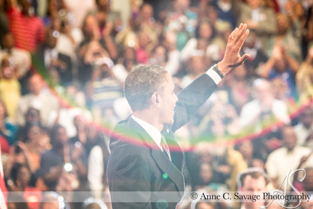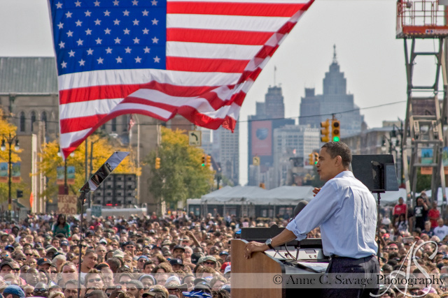 Obama’s next rally in Michigan was on Labor Day and the Detroit News hired me to do a panoramic image of that rally, as well. As I walked up to the media table that day, I was approached by a woman who worked for Obama for America (OFA) and asked, “Are you Anne Savage?” She said that she saw my panoramic image of Obama at Joe Louis and was very impressed. She said it went viral with the OFA group in Chicago. She gave me her card and said to contact her if I wanted to photograph Obama if he returned to Michigan for another rally. He did return, several more times, in fact, and I was there for each one.
