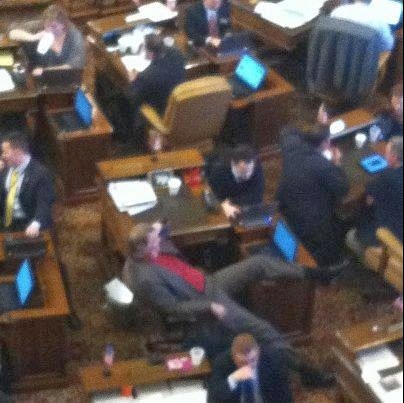 To get things started, here’s a picture Kitty McClain sent to Tony Trupiano of Senator Jack Brandenburg during last week’s Right to Work for Less debate: