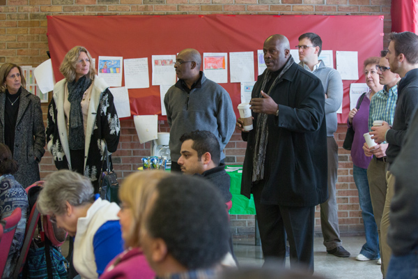 Washtenaw County Sheriff Jerry Clayton (wearing the scarf) asks Mark Brewer about the lack of racial diversity among Michigan Democratic candidates