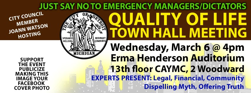 Today at 4 p.m., there will be a townhall meeting in Detroit, Michigan to protest the imposition of an anti-democratic Emergency Financial Manager on Michigan’s largest city. Details are below. You can RSVP and get more information at their Facebook event page HERE.
