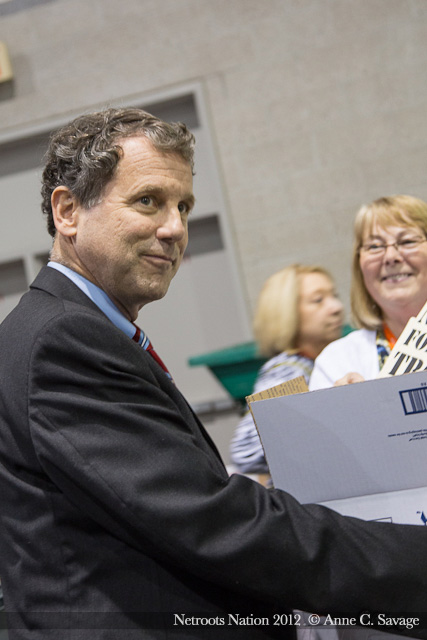 Ohio Senator Sherrod Brown packing a CARE package during the Netroots for the Troops event at Netroots Nation