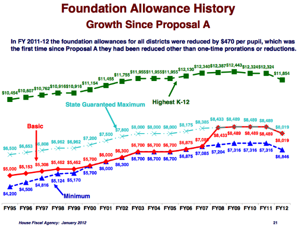 In 1994, Michigan voters approved Proposal A which dramatically impacted how much of school funding came from local sources, primarily property taxes and how much from the state. Before Prop A, 63% of school funding depended on local sources. In 1995, that dropped to 20%. This was intended to equalize the disparity between the wealthiest districts and the poorest districts. And it did a very good job of doing that. Prop A created “foundation grants” meant to equalize per-pupil funding. However, because taxpayers can agree to tax themselves to increase school funding, some school districts get WAY more than others. Here’s the data from the 2011-12 school year: