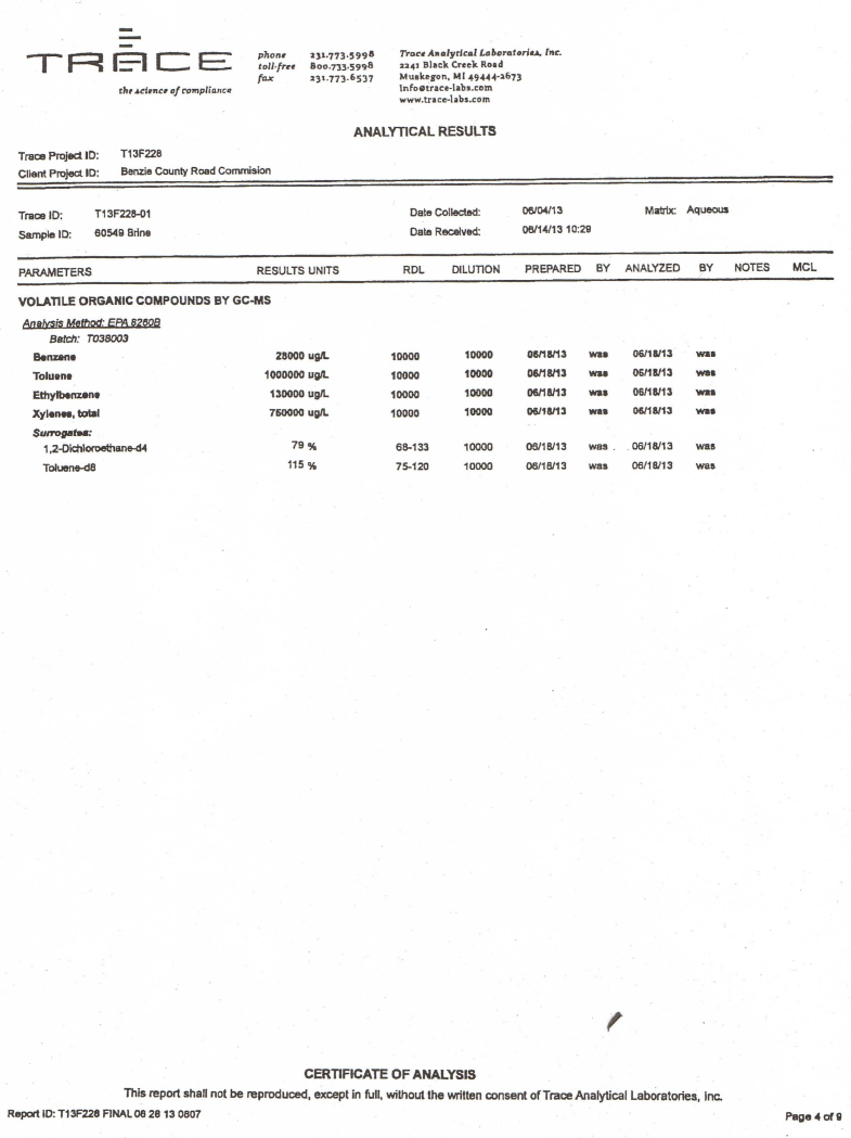 The brine sample contained 28,000 parts per billion of benzene, a known human carcinogen; 1,000,000 parts per billion of toluene, a toxic aromatic solvent; 130,000 parts per billion of ethylbenzene, a toxic solvent; and 750,000 parts per billion of mixed xylenes, another class of toxic solvents.