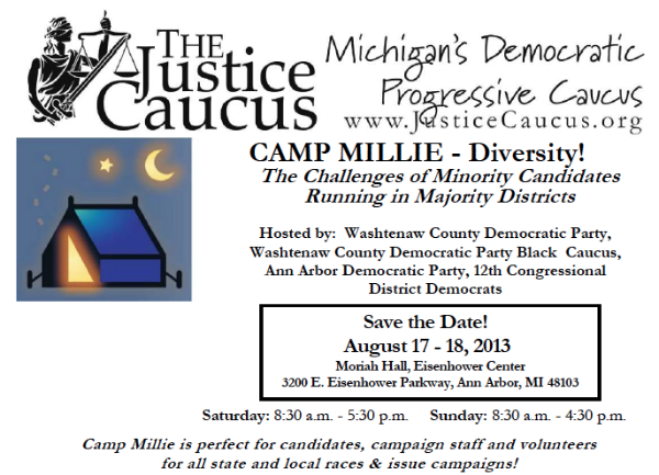 Every year, the Michigan Democratic Party Justice Caucus holds a two-day training workshop known as Camp Millie. It is a well-known and highly respected event aimed directly at progressive activists, candidates, and future staffers for elected officials. This year’s Camp Millie is titled “Diversity: The Challenge of Minority Candidates running in Majority Districts” and is co-sponsored by the Washtenaw County Democratic Party, the Washtenaw County Democratic Party Black Caucus, the Ann Arbor Democratic Party, and the 12th Congressional District Democrats.