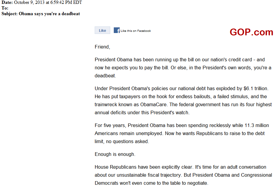 It’s an email so full of lies that it ought to be declared false advertising with someone going to jail for it. The worst bit is the whole “won’t even come to the table to negotiate”. This week, for example, President Obama literally invited the entire Republican caucus, all 232 of them, to a meeting to discuss the current situation. They are sending 18. Not only that, over the past six months, John Boehner has continuously refused to conference with Senate Democrats on resolving the budget impasse.
