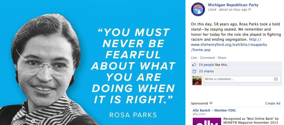 The Michigan Republican Party is attempting to co-opt Rosa Parks, champion of civil rights and a hero to the left, and her message of courage in the face of adversity. Their party is anything but pro-civil rights but they want you to forget that and believe an alternate reality.