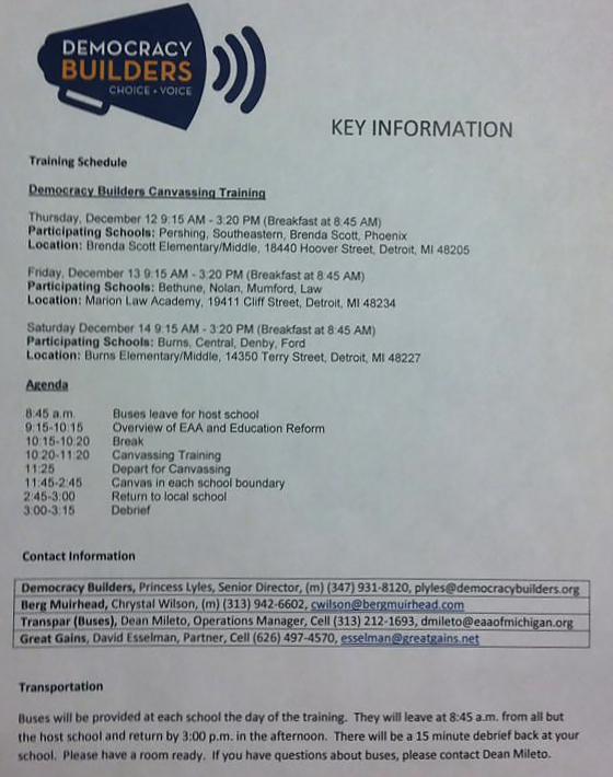 - Back in December, a group called Democracy Builders out of New York that is part of the Democracy Prep Charter School came to Detroit and conducted a “canvas” within the EAA school district boundaries. The canvas included EAA teachers and other adults although, so far, I have been unable to determine the exact intent of the time they spent here. Here is the schedule: