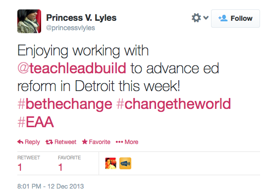 The Democracy Builders training model prepares parents for civic engagement and uses a “train-the-trainer” approach to dramatically impact communities through grass-roots advocacy. Parents have used these skills to help secure facilities for their schools, increase the charter cap, eliminate the funding-freeze on public charter schools, and pass the school reform measures needed to help win New York’s Race To The Top grant. Parents have made tens of thousands of phone calls, mailed thousands of postcards, connected with thousands of other parents in person and on the phone, conducted dozens of legislative office visits, and given testimony and dozens of public hearings.The highlighted part there shows that this is yet another group working to expand charter schools, a national effort that is harming public schools and fattening the wallets of for-profit corporations by funneling tax dollars into their bank accounts. Democracy Builders have had revenues of over $325,000 for 2010 and 2011 according to their 990 tax forms. So what were they doing in Detroit working with the EAA? Were Michigan tax dollars used to pay them to come to Detroit to recruit students into the EAA? Why were teachers taken out of the classroom to participate? I have reached out them by email but have not gotten a response. Their leader Princess Lyles tweeted about their Detroit visit while she was but doesn’t explain what it was, exactly, that they were doing here: