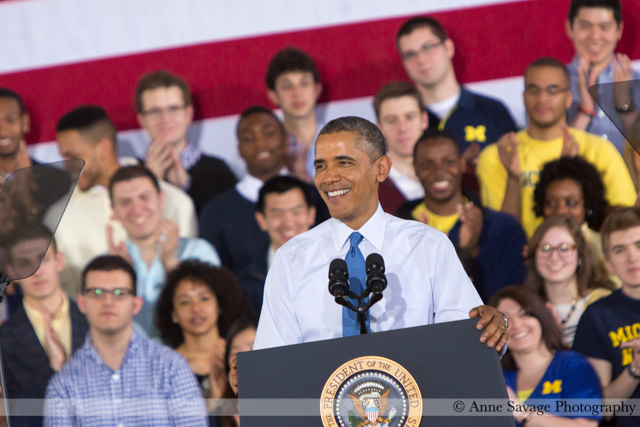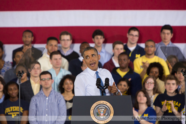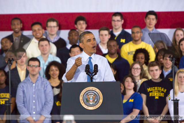 President Obama came to Ann Arbor, Michigan yesterday to promote raising the national minimum wage to $10.10. His speach was full of energy and populism and had the crowd of around 1,400 on their feet and energized for the entire 35 minutes.