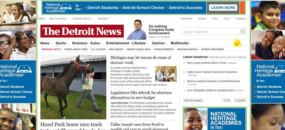 One of the main players in the for-profit charter business is National Heritage Academies, Michigan’s largest for-profit school management company. In response to this incredible journalism by the Detroit Free Press, they have purchased pretty much all of the ad space on the front page of the Free Press website this morning. Here’s a screenshot: