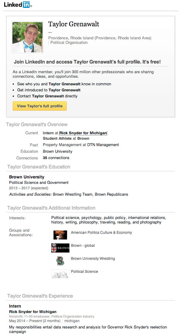 Note that in the “About” section, Grenawalt lists himself as an intern for Rick Snyder. [Grenawalt removed this from his profile sometime after the publication of this post.]