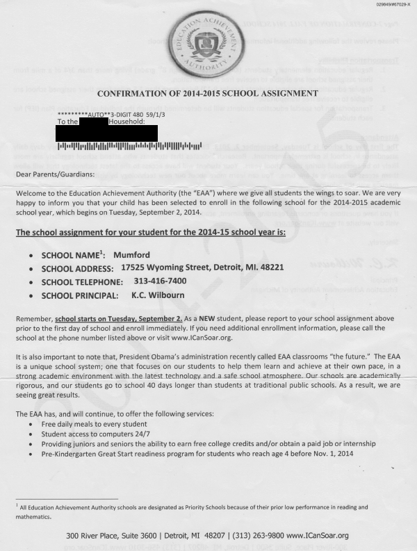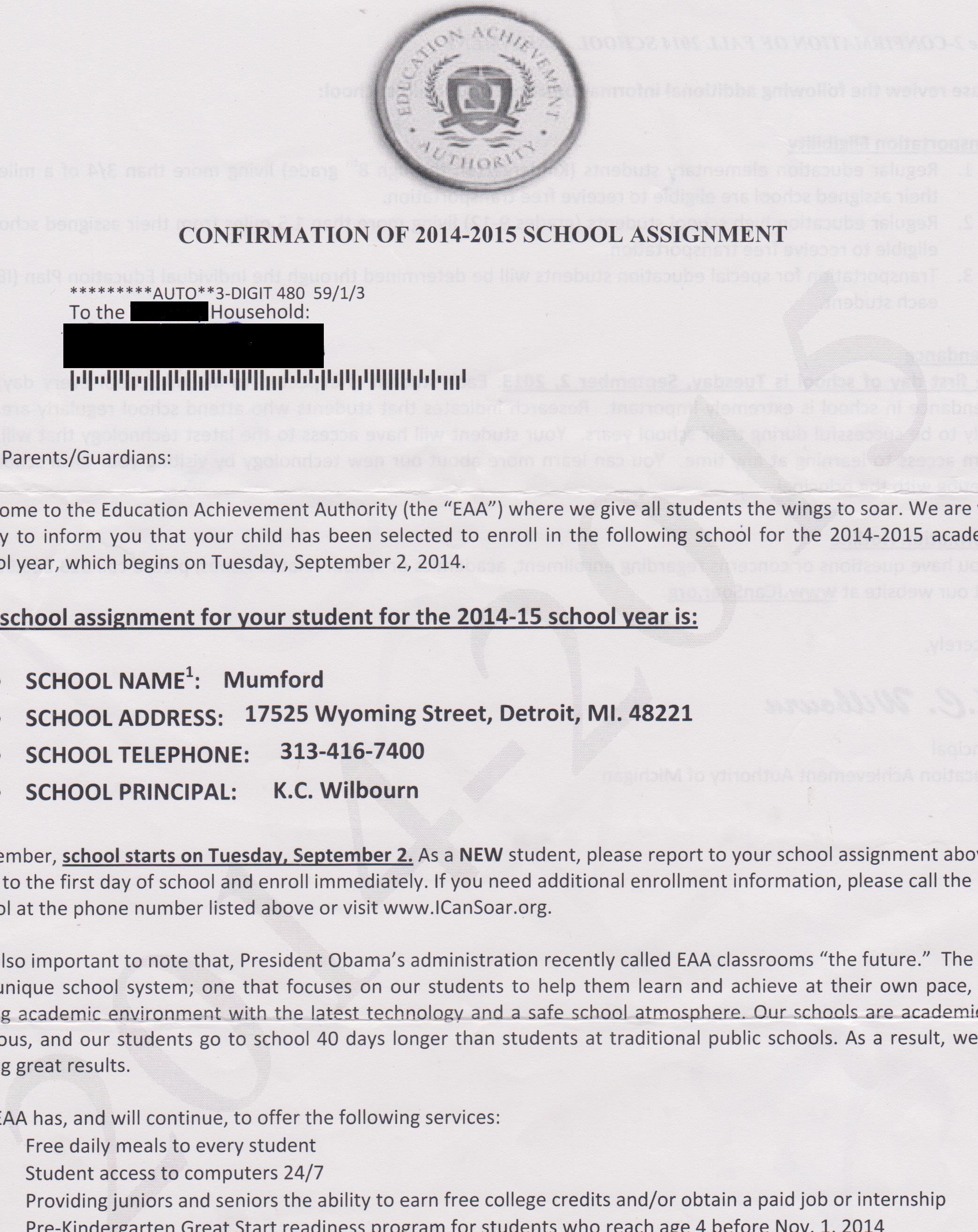 This past week, parents of students outside of the EAA have been receiving letters from the EAA. The letters are recruitment letters, trying to bring in more students, but masquerade as official letters informing the parents that their students have been formally assigned to the EAA. Keep in mind that the EAA was created out of the schools with the poorest academic performance in Detroit.