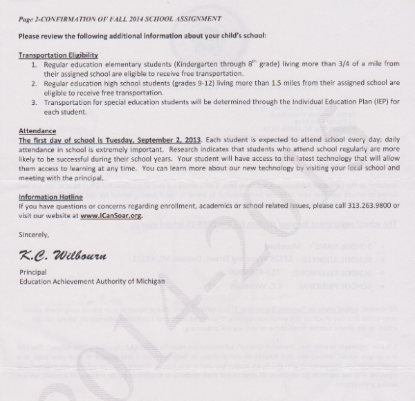 The title of the letter is “Confirmation of 2014-2015 School Assignment”, which any parent would be forgiven for believing is a formal reassignment of their child to the EAA’s school. However, if you read the body of the letter, you see that it’s actually just an invitation and that their children have been “selected to enroll”. In other words, it’s an incredibly deceptive and unethical way to bring in new students from other school districts. The letters shown here, in fact, were sent to a parent in Ferndale, a suburb 12 miles north of downtown Detroit. This parent happens to be Karen Twomey, the secretary of the Ferndale Schools Board of Education and a teacher in Bloomfield Hills. As an informed educator, Twomey was able to spot the deception immediately. Not all parents would have that ability to see these letters for the deception that they are.