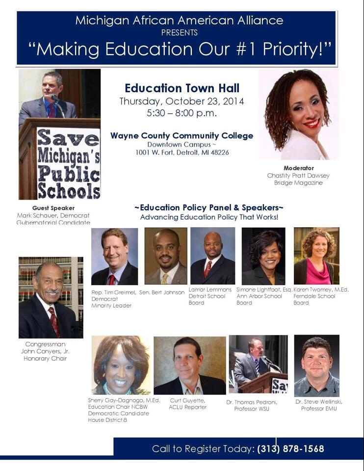 UPDATE: As an alternative to the Ann Arbor EAA dog-and-pony show, public school advocates will be joined in Detroit tomorrow evening at 5:30 by Democratic candidate for Governor Mark Schauer for an Education Town Hall. Also scheduled to participate are Congressman John Conyers, Jr. and whole variety of public education advocacy all-stars. Click the image below for a larger flyer and click HERE for an agenda.