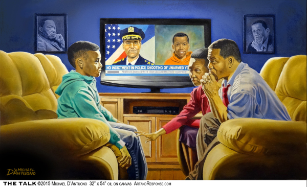 In honor of Martin Luther King Day, activist artist Michael D’Antuono is releasing “The Talk,” his painting highlighting the inconsistent progress America has made concerning racial justice since Dr. King’s historic Selma to Montgomery marches.The painting depicts a pair of concerned African American parents sitting across from their son, bathed by the blue light of the television news reporting no indictment of a police officer in the shooting of an unarmed black child. In the background on either side of the television hang portraits of a seemingly distressed Dr. King and President Obama. One can assume that the talk referred to in the painting’s title is one that few white parents have, with the famous exception of New York mayor Bill DiBlazio.