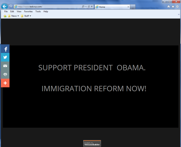 At 12:09 a.m this morning, Texas Senator Ted Cruz announced his candidacy for president. As it turns out, like Hoekstra, Cruz neglected to register TedCruz.com. So, now when you go to that site, you see this: