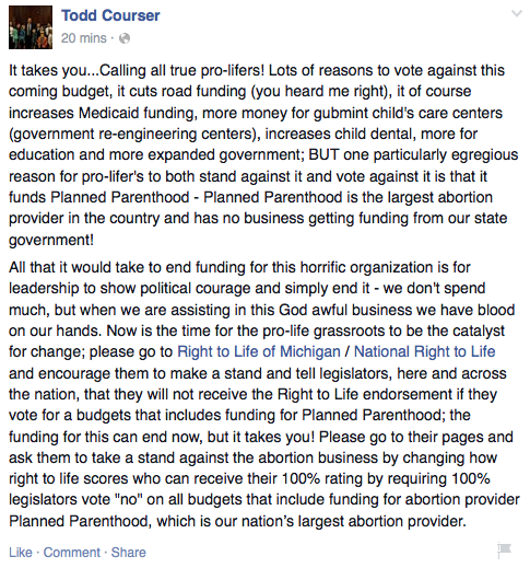 On his Facebook page today, as part of an anti-Planned Parenthood rant, Courser refers to child care providers as – I’m not kidding here – “gubmint child’s care centers” & “government re-engineering centers”: