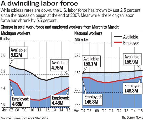 The bad news is that a big part of the reason the state jobless rate dropped was that since 2007, nearly 300,000 Michigan workers had given up looking for a job. Workers older than 60 retired early after finding no jobs available after the recession hit. And those younger than 25 stay on the employment sidelines in school, where they can borrow to cover their tuition. Others, however, in the peak of their working years, lack the education and skills needed for modern jobs. Add them into the unemployment calculations, and the official unemployment rate would more than double.