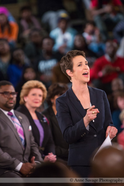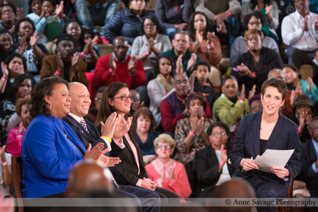 MSNBC host Joy Ann Reid came out to warm up the crowd before the taping began. After that, Maddow herself came out to speak to the residents of Flint, to express how bad she felt that it took so long for their story to be told, and to let them know how much she loves them.