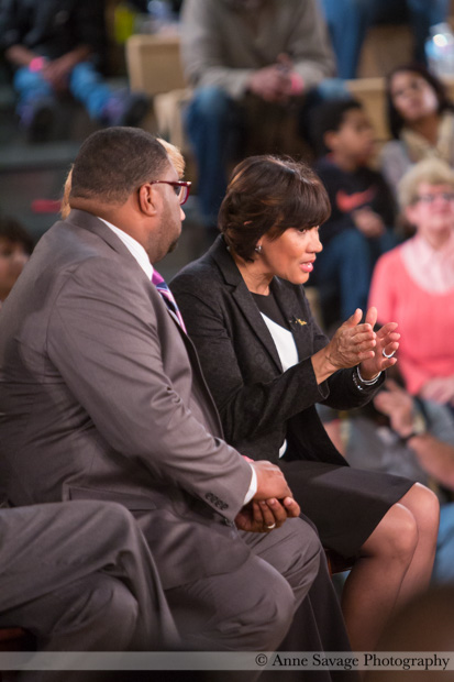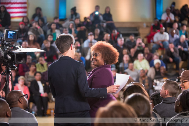 I won’t rehash the entire town hall. If you haven’t seen it, you should check out the clips that are online HERE and watch it in its entirety when it becomes available. I do, however, want to note some highlights and, of course, give you some behind-the-scenes glimpses of what it looked like from inside the gymnasium at Flint’s Holmes STEM Academy where the event was held.