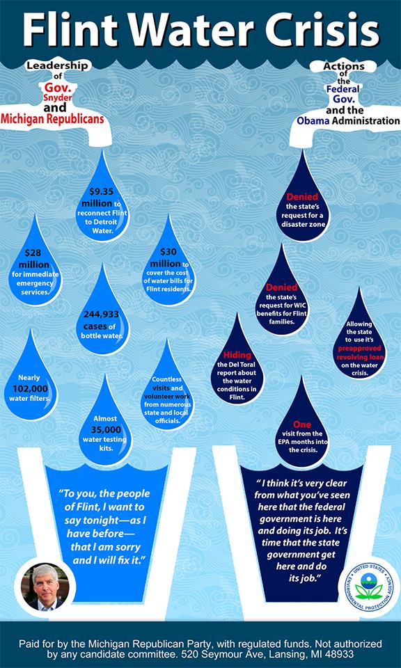 After passing legislation to slash revenue sharing to already struggling urban areas including Flint and after passing an anti-democratic Emergency Manager Law – Public Act 4 – and after passing another anti-democratic Emergency Manager law – Public Act 436 – after voters rejected the first one (and making it democracy-proof with an unnecessary appropriation) and after these Republican-appointed overseers – the Emergency Managers of Flint – made decisions that lead to the poisoning of Flint’s drinking water and after our Republican-led administration altered water test data to avoid taking action when lead was found and after our Republican administration lied to the USEPA about treating the Flint River water and after our Republican administration violated the Clean Water Act and the Lead and Copper Rule and after our Republican administration ignored, maligned, and ridiculed the heroes who blew the whistle on the Republican-made catastrophe in Flint and after our Republican-run administration ignored and delayed and obfuscated until they no longer could and were forced to take action months after lead was found in Flint’s drinking water, Michigan Republicans now want you to believe that THEY are the ones taking care of business and that the federal government is somehow failing Michigan.