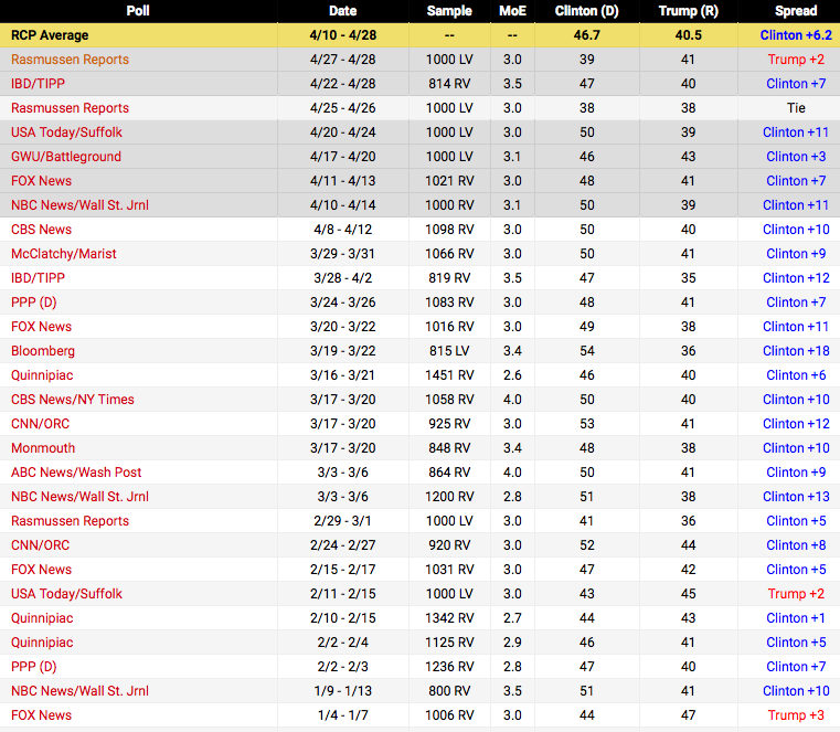 In the dozens of polls conducting pitting Trump against Clinton this year only 3 have had Trump up.