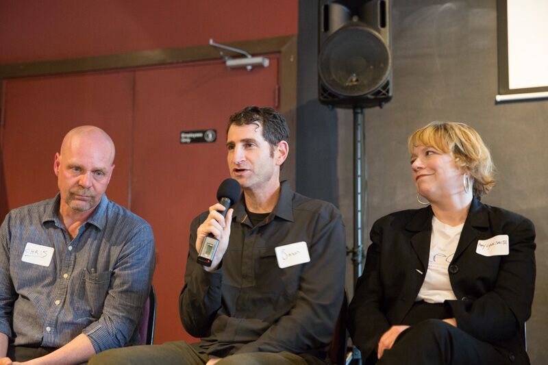 Clean Water Action Executive Director Nic Clark peaces out sitting next to Michigan Democratic Party Chair Brandon Dillon with Jen Stayer Eyer sitting on the far right