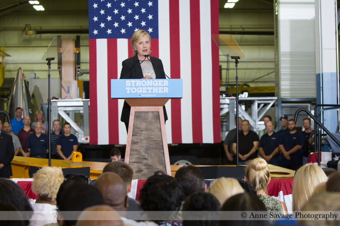 Clinton also condemned Trump’s hypocrisy on trade. “Now, before he tweets about how he’s really one who’ll put ‘America First’ in trade, let’s remember where Trump makes many of his own products. Because it’s sure not America. He’s made Trump ties in China and Trump suits in Mexico instead of here in Michigan. He keeps saying it’s not possible to make these things in America anymore. That’s just wrong.