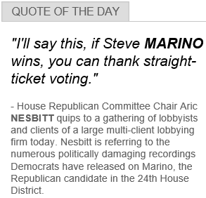 – House Republican Committee Chair Aric NESBITT quips to a gathering of lobbyists and clients of a large multi-client lobbying firm today. Nesbitt is referring to the numerous politically damaging recordings Democrats have released on Marino, the Republican candidate in the 24th House District.