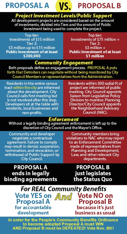 It is imperative that voters get on the right side of Proposal A this election season and vote down Proposal B. As is typical with politicians who don’t move in the best interest of the people, Scott Benson is on the wrong side of the Community Benefits Ordinance. We must not allow bells and whistles to distract us from voting on the side of the people of Detroit.