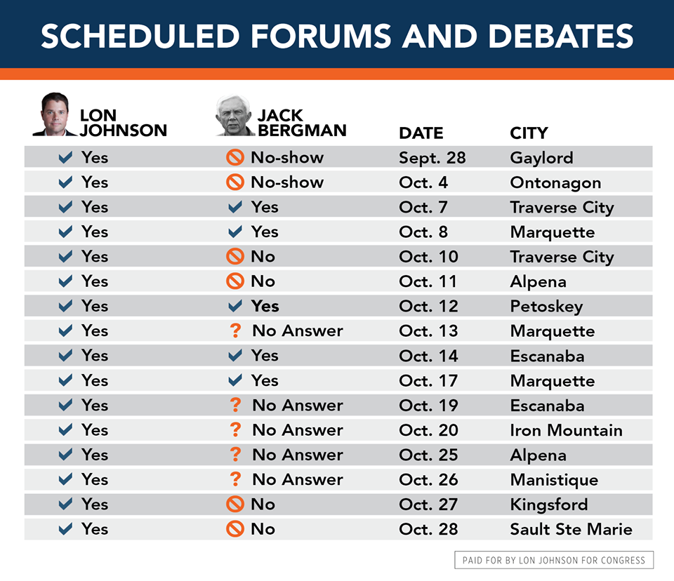 Bergman appears to know he’s terrible when he has to deal directly with voters. He’s been skipping out on multiple debates and forums with Johnson. Here’s the tally so far: