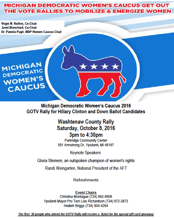 The Michigan Democratic Women’s Caucus is holding a Get Out The Vote (GOTV) Rally for Hillary Clinton and all Democrats this Saturday, October 8th from 3:00-4:30 p.m. at the Parkridge Community Center in Ypsilanti (591 Armstrong Drive.) They have two very special guests: Women’s Rights pioneer and founder/publisher of Ms. Magazine Gloria Steinem and AFT President Randi Weingarten.
