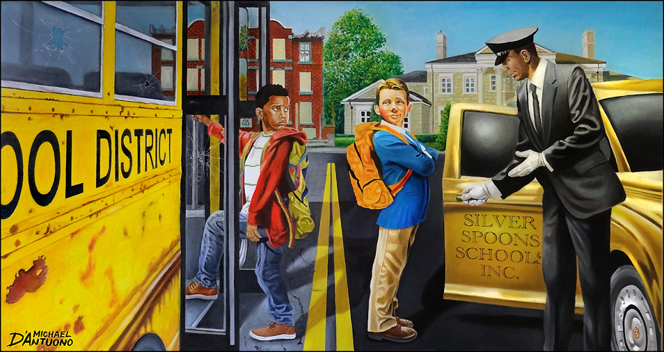 Artist/activist, Michael D’Antuono, known for his hard-hitting paintings on socio-political issues, is releasing his condemnatory visual indictment of a DeVos appointment, titled, “Class System” just in time for DeVos’s confirmation hearing. The painting depicts a stark contrast between two children being transported to school. One, a black child, is boarding a rusted out public school bus with broken windows, the other, a wealthy while child, is being escorted into a private school’s limousine by his chauffeur.