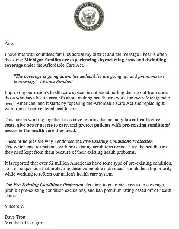 I’m one of Rep. Trott’s constituents and received the letter Weberman mentioned — in response to my repeated calls and emails to the Congressman’s office about the fact that my premiums will skyrocket if the ACA is repealed and replaced with the AHCA, because I have diabetes. Countless other constituents have tried to tell Rep. Trott their stories, which have fallen on deaf ears.