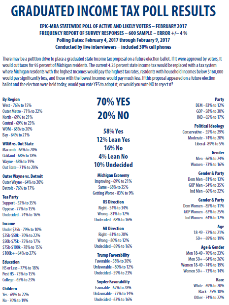 A full 70% of Michiganders favor this tax proposal. It doesn’t matter how you slice the respondents demographically, a majority of people like this idea. A LOT. Even people with incomes over $100,000 a year support it 64% to 27%.