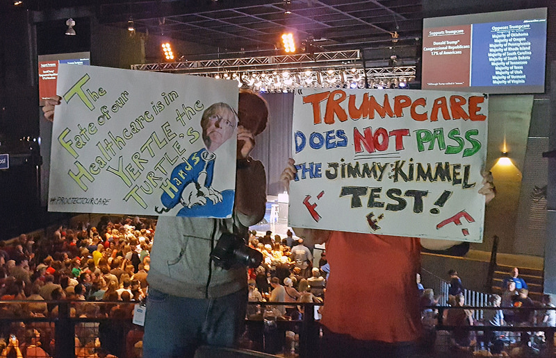 At a town hall Thursday filled with Indivisible activists, Senator Jerry Moran — who revealed he was against Senate Trumpcare after a vote was postponed — criticized the shoddy process that generated the bill refusing to back or oppose it, while expressing concerns about its cuts to Medicaid and people with disabilities. (The bill doesn’t just cut Medicaid but it’s designed to drive those who might be eligible for it into debt and misery.)