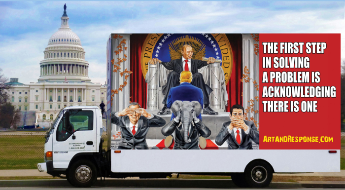 The second billboard depicts Trump kneeling before Putin as Mitch McConnell, a man wearing an elephant mask and Paul Ryan assume the see no evil, hear no evil, speak no evil posture. The copy reads, “The First Step in Solving a Problem is Admitting There is One.”