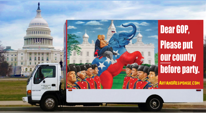 One billboard depicts Trump hugging Putin on top of a GOP painted elephant in front of a Kremlin styled White House complete with Russian flag as prominent Republicans dressed in Russian military uniforms stand guard. The copy reads, “ Dear GOP, Please Put Our Country Before Party.”