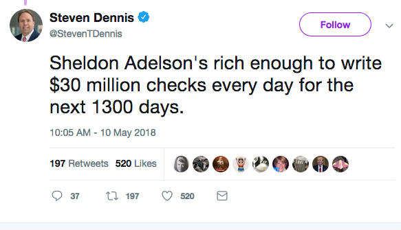 For the price of 5 percent of his company’s tax cuts from JUST THIS QUARTER, the casino billionaire put the GOP a lot closer to preserving their rule, preventing any actual oversight of the Trump Administration (or the Census) and making a mockery of the rule of law.