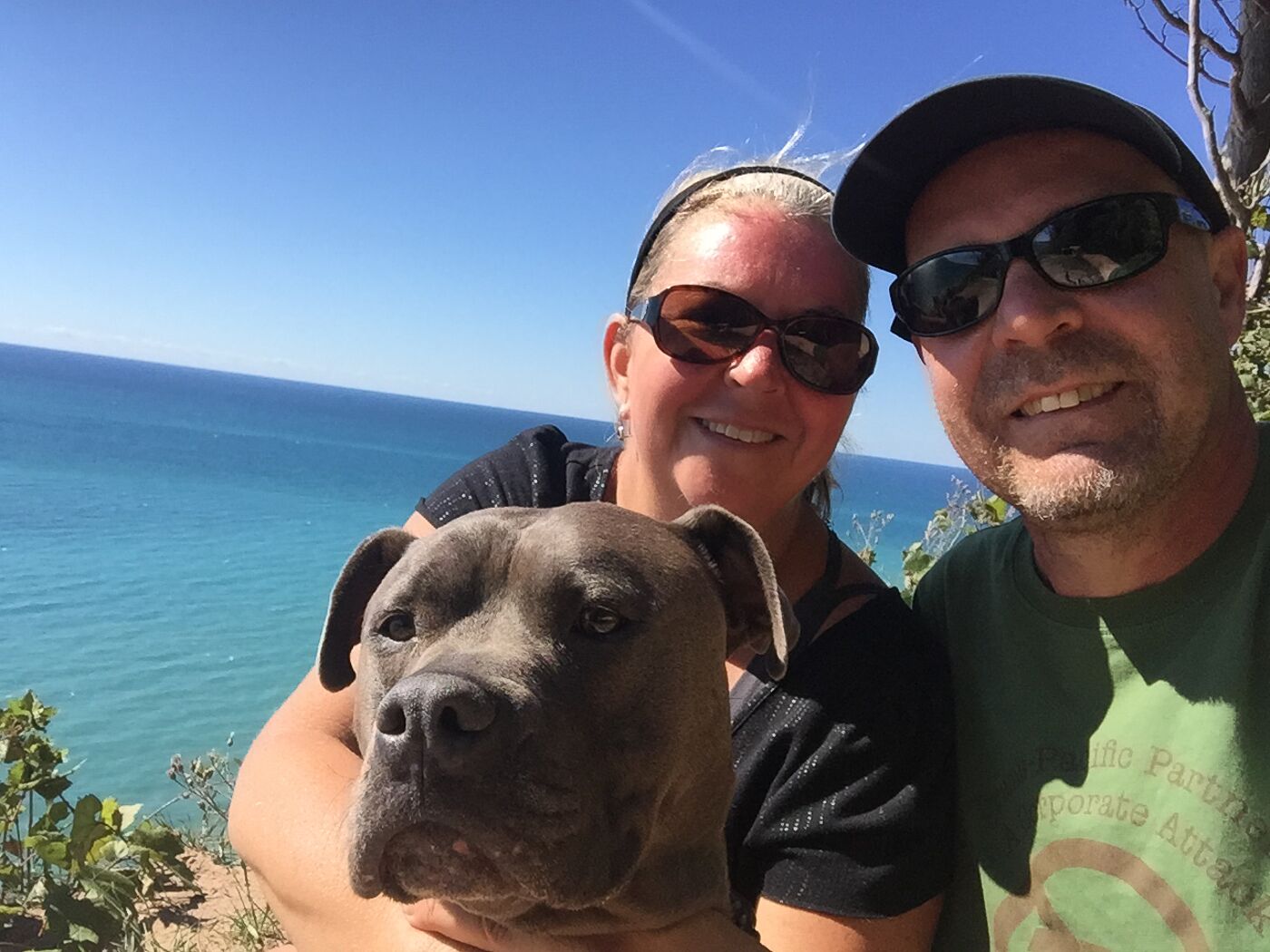 Anne and Eclectablog and Suni on a tall dune in the Sleeping Bear Dunes overlooking Lake Michigan