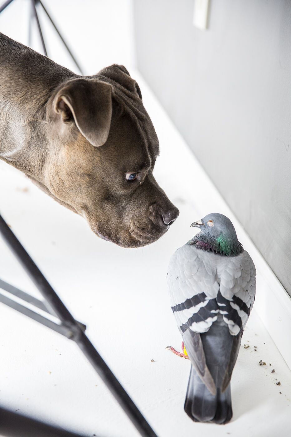 Suni is GREAT with other animals. One time, an injured homing pigeon wandered into Anne’s office. Suni alerted Anne and she took him to the HSHV where it was eventually reunited with it’s person: