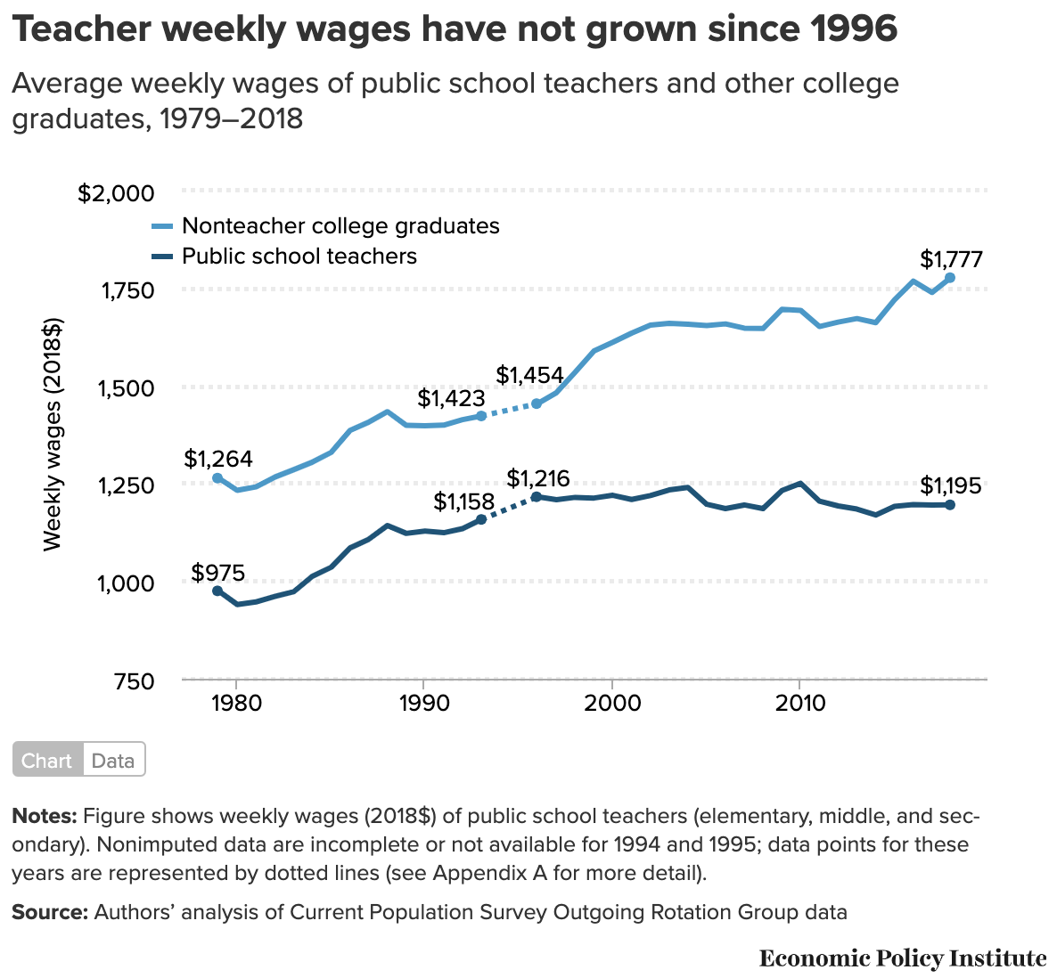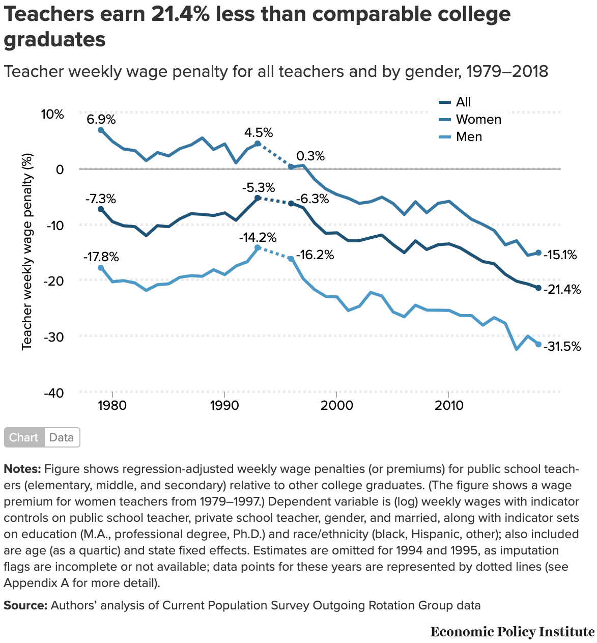 - For all public-sector teachers, the relative wage penalty (controlling for education, experience, and other factors known to affect earnings) has grown substantially since the mid-1990s. The teacher weekly wage penalty was 5.3 percent in 1993, grew to 12.0 percent in 2004, and reached a record 21.4 percent in 2018.