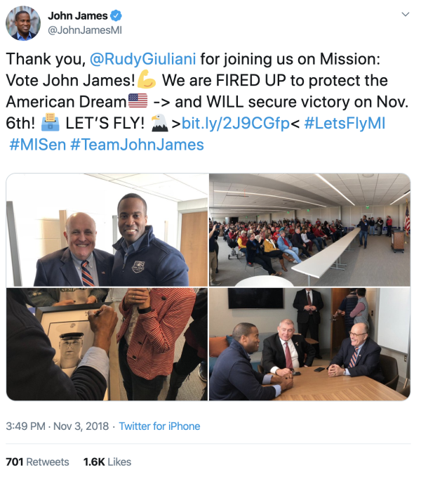 Thank you, @RudyGiuliani for joining us on Mission: Vote John James!💪 We are FIRED UP to protect the American Dream🇺🇸 -> and WILL secure victory on Nov. 6th! 🗳 LET’S FLY! 🦅>https://t.co/R24KGtLlEP< #LetsFlyMI #MISen #TeamJohnJames pic.twitter.com/5lY5VeJxne