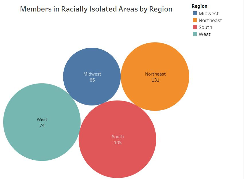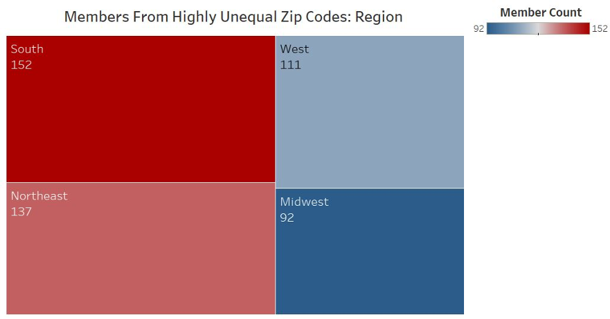 The aforementioned ACS data shows that over 60% of the members live in zip codes with less than 35% people of color. This shows that generally the US members tend to live in very racially homogenous areas.