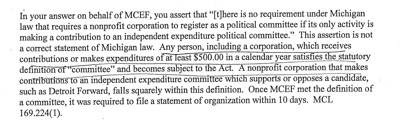 Perhaps the Secretary of State’s Office should also investigate the questionable finances of Unlock Michigan and their non-profit contributors, which even Republican Bob LaBrant has called out as a campaign finance violation. Also, back in 2014, when another Republican, Ruth Johnson, served as the Secretary of State, her Office held in the Turnaround Detroit v. Detroit Forward campaign finance complaint: